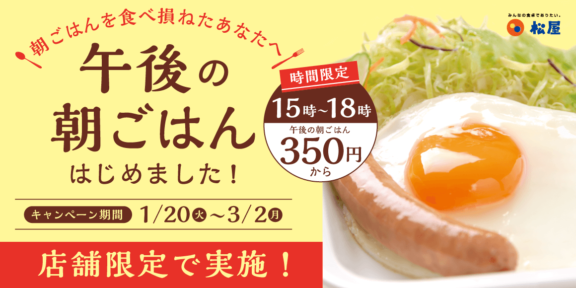 埼玉県内の松屋102店舗限定で、朝の人気メニュー「朝定食」を15時から18時の時間帯でもお楽しみいただける「午後の朝ごはん企画」を期間限定で実施します。