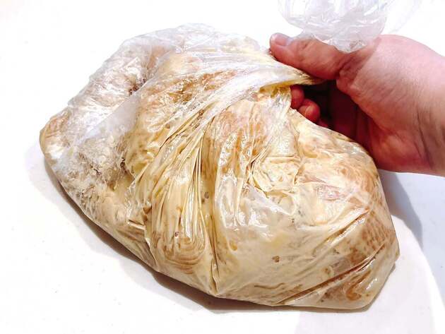 ポリ袋に【衣】の材料を追加して、さらに揉み込みます。