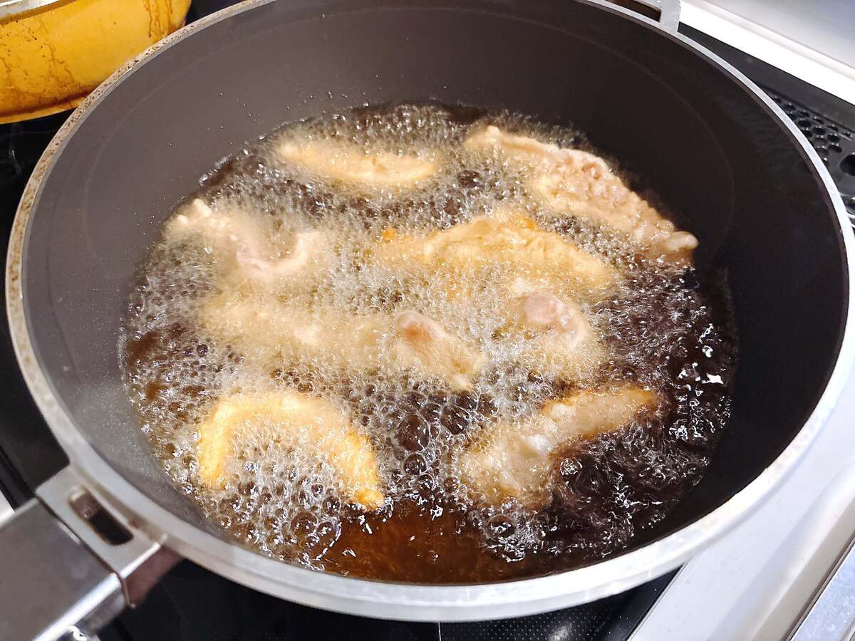 フライパンに少なめの油を入れ、中火で揚げ焼きします。油の量は、ご家庭の調理器具の取扱説明書に従ってくださいね。