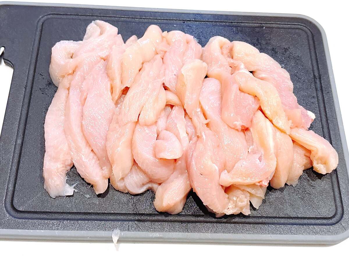 鶏むね肉は、あらかじめ食べやすい大きさに切っておきましょう。スティック唐揚げなので、細い棒状にカットしました。