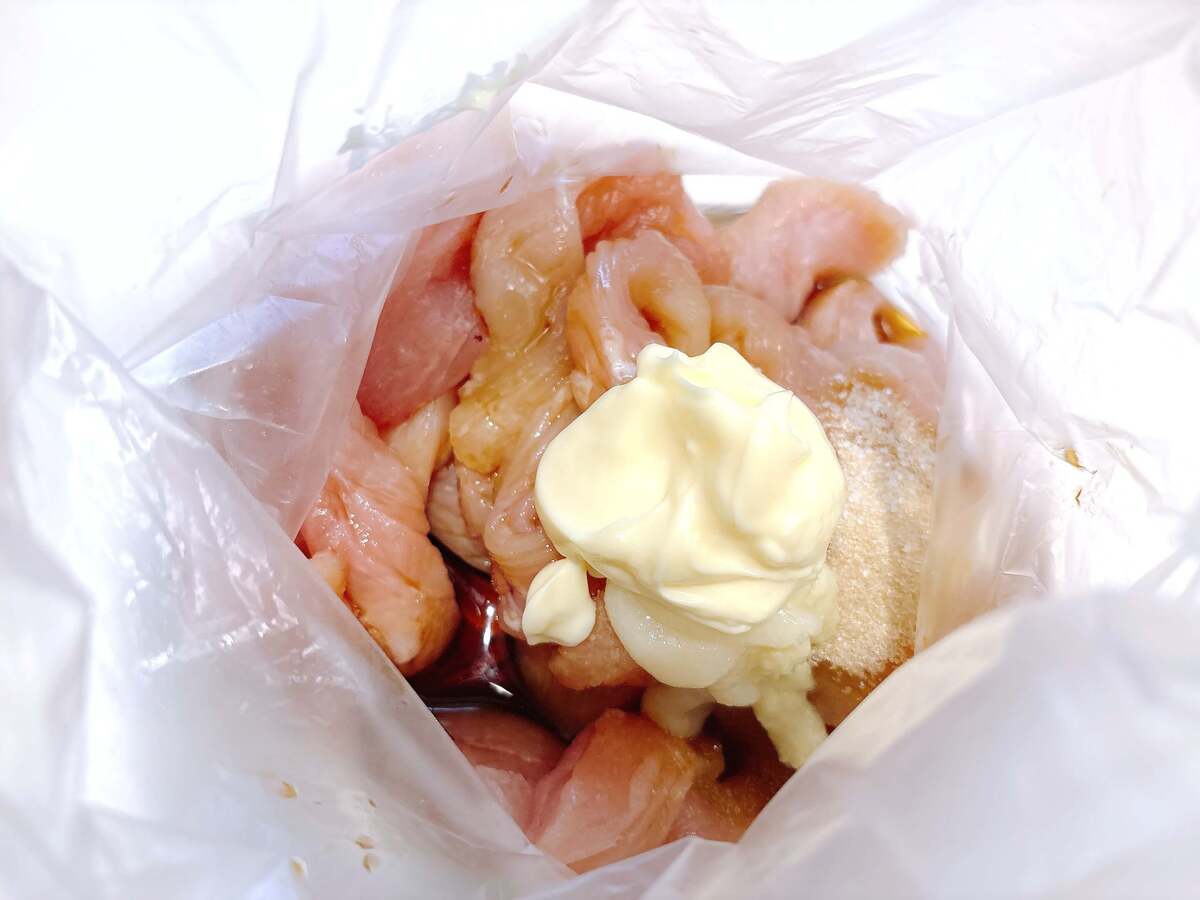 作り方①ポリ袋に、鶏むね肉と【A】の調味料を入れて混ぜます