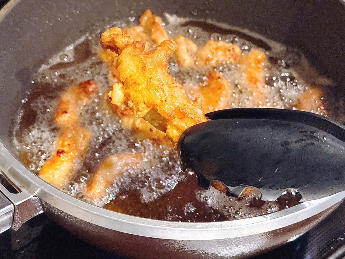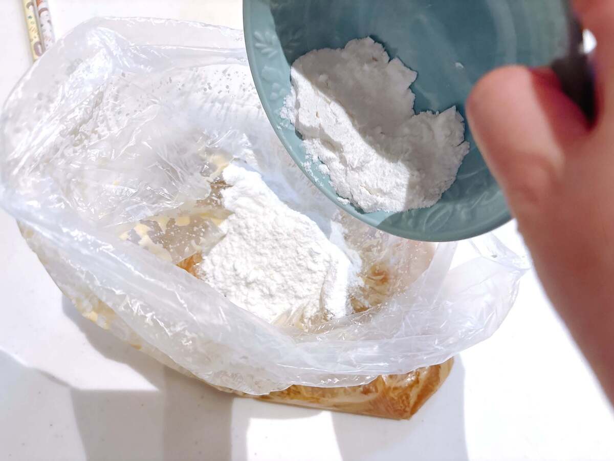 作り方②薄力粉と片栗粉をポリ袋に入れて揉み込み、油で揚げ焼きします