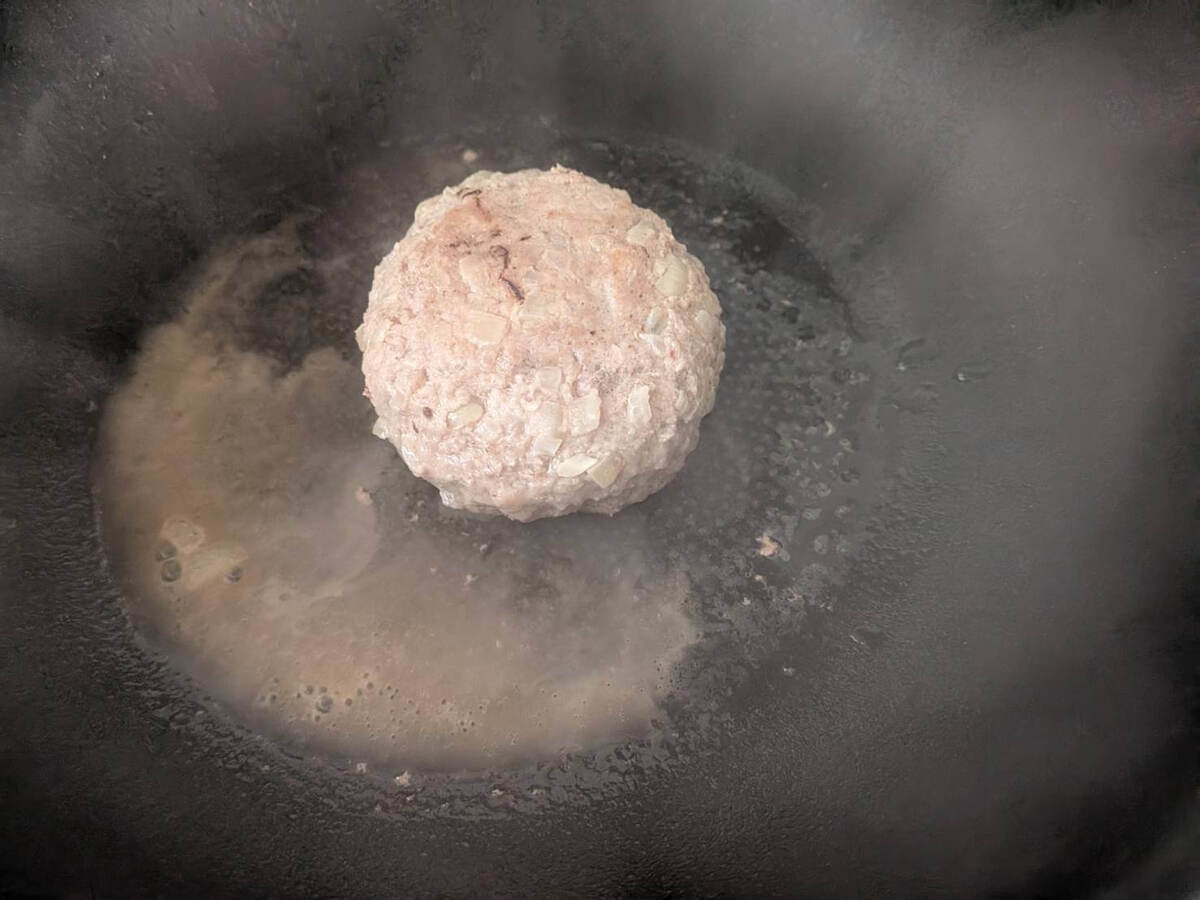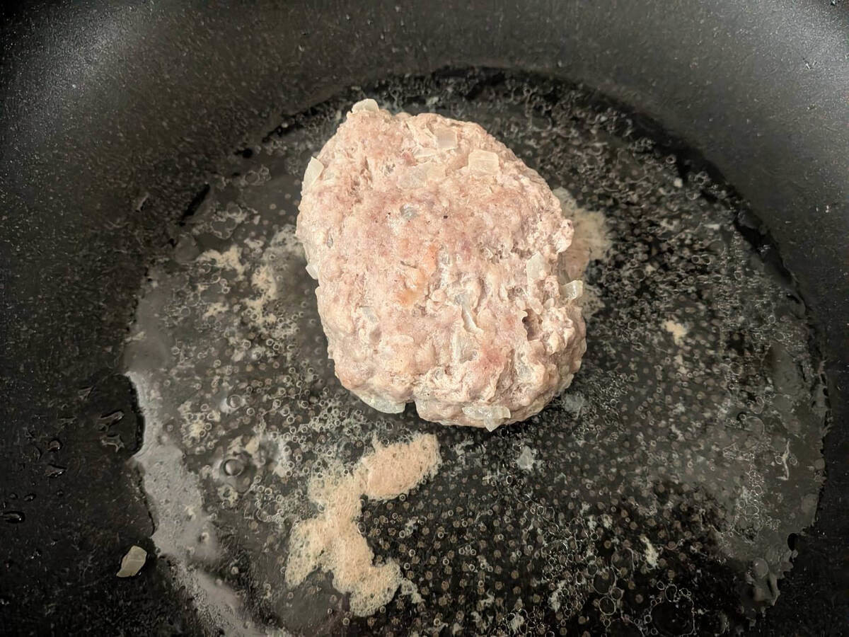 しっかり予熱してからフライパンの上に肉だねをのせます。
