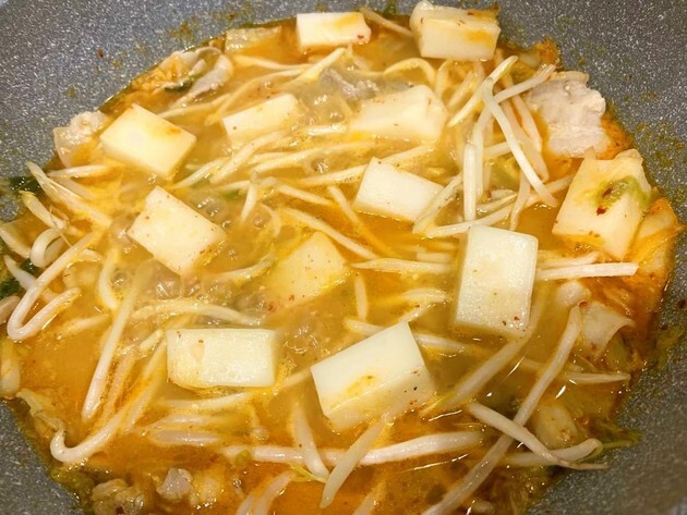 キムチ鍋の作り方⑤野菜とお餅を加えて煮る