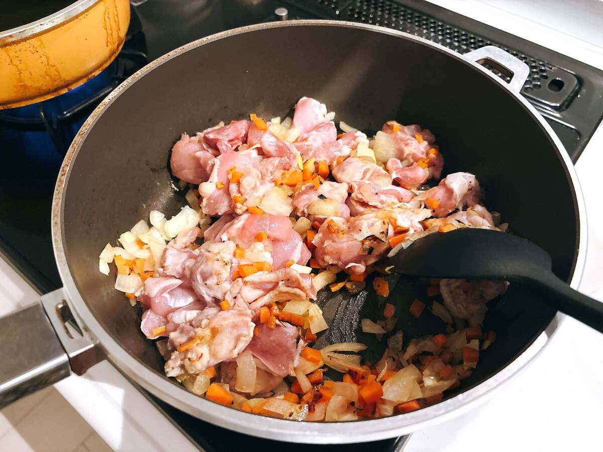 野菜がしんなりしてきたら、鶏肉を入れて炒めましょう。