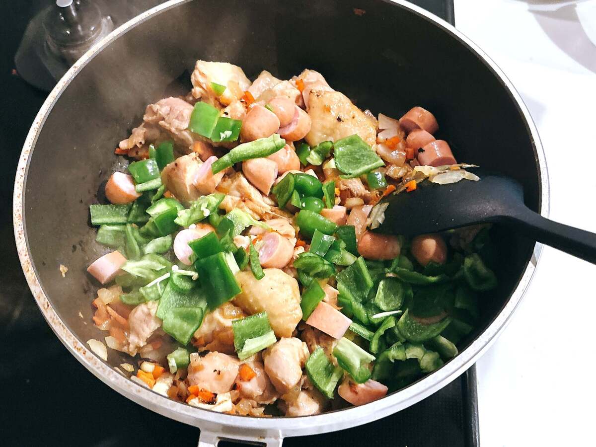 鶏肉に火が通ったところで、ソーセージとピーマンも加えます。ピーマンの食感と風味が残るよう、さっと炒める程度でOKです。