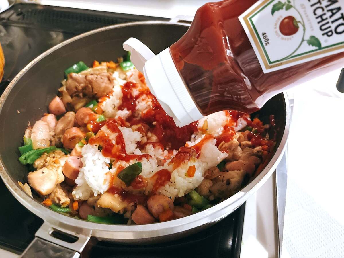 トマトケチャップを大さじ4~5程度加え、全体がムラなくなじむまで炒め合わせます。