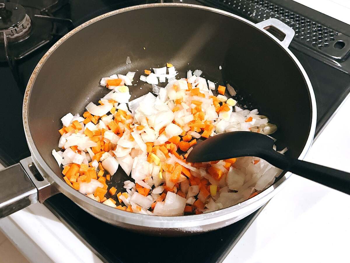 作り方②フライパンで玉ねぎ・にんじんを炒める
