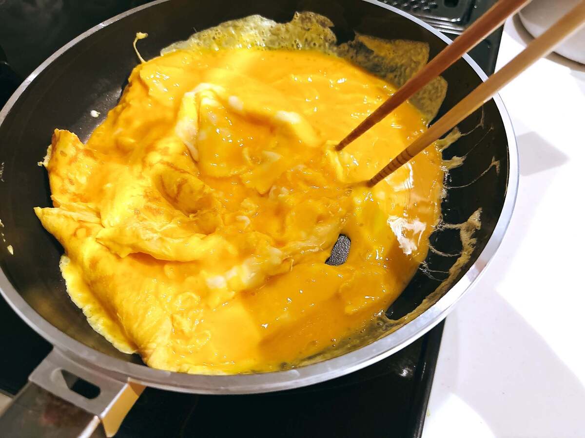 卵のふちがかたまってきたところで、菜箸で大きくひと混ぜ。
