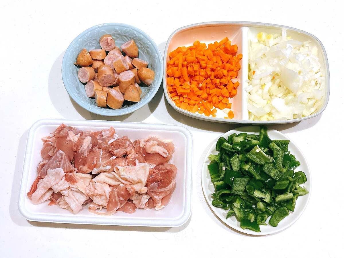 まずは野菜をすべてカットします。ピーマンはヘタと種を取って1cm角に、玉ねぎ・にんじんも1cm角に切りましょう。