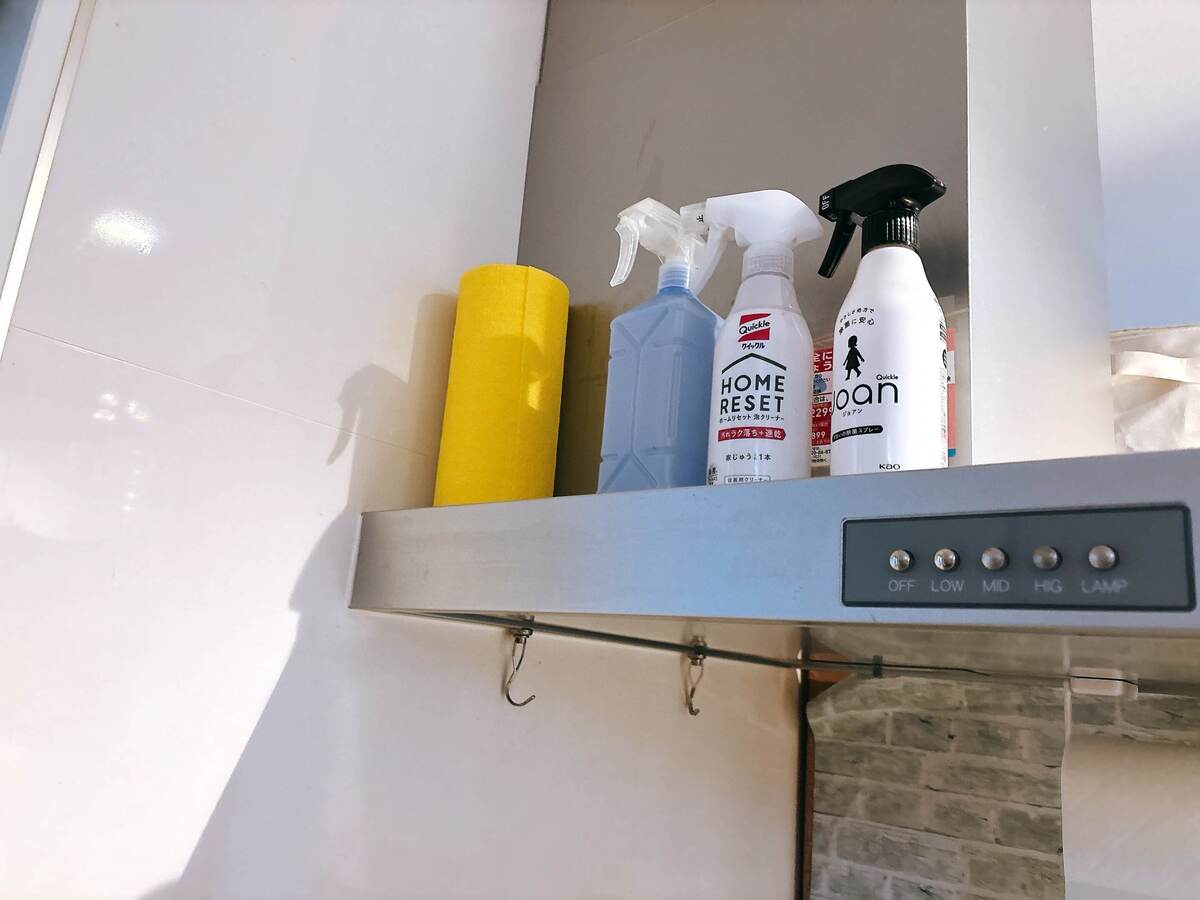 換気扇の上、気づいたら物置き場になっていませんか?洗剤や調味料をちょい置きするのにちょうどいいですよね。気持ち分かります……。人によっては、インテリアを置いておしゃれな空間にしているケースもあるのでは。
