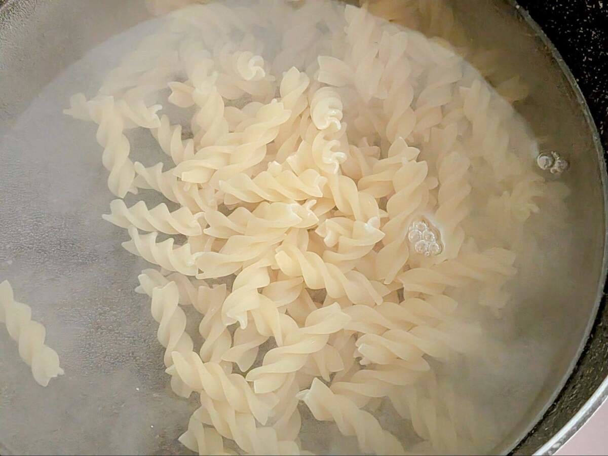 動画ではフジッリと呼ばれる、らせん状にねじれた形のショートパスタを使用していたので、合わせて用意しました。