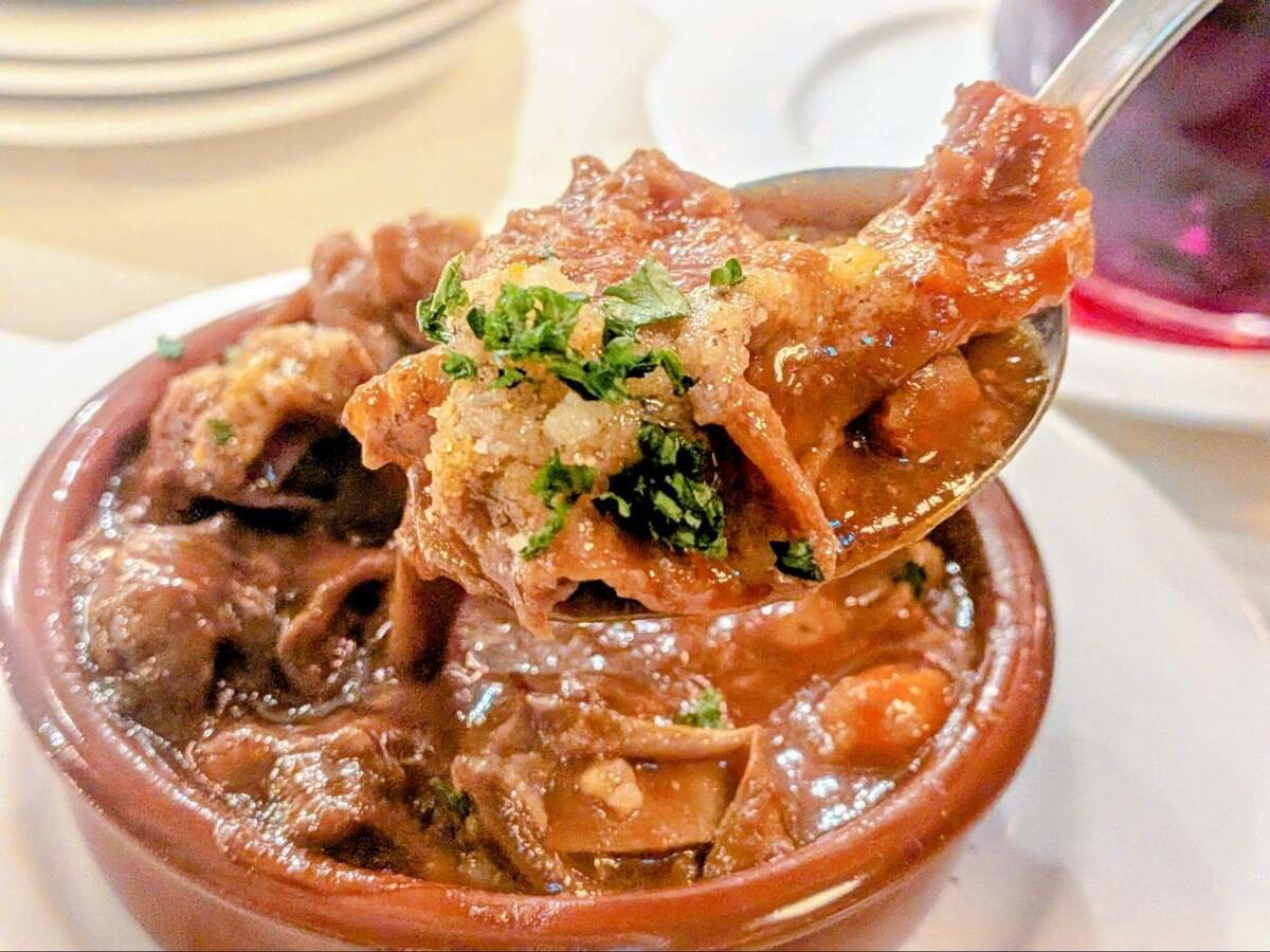 赤ワインに合わせたのは、番組で一番人気と紹介されていた「デミグラスもつ煮(780円 税込)」。特製のデミグラスソースで、もつを約4時間煮込んだ一品です。