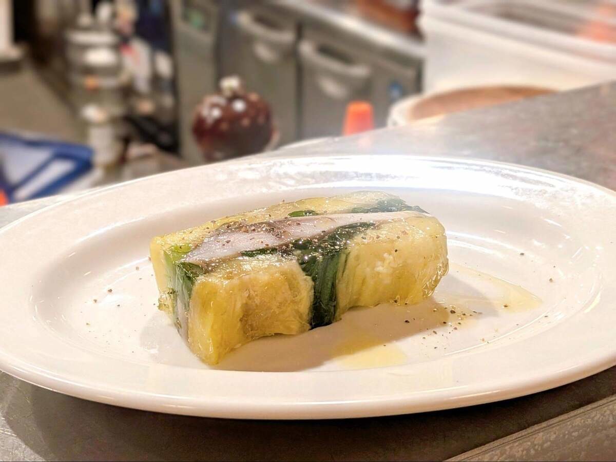 一緒に行った友人は「〆サバと焼きなすのテリーヌ(680円 税込)」と「なみなみワイン・白」をチョイス。