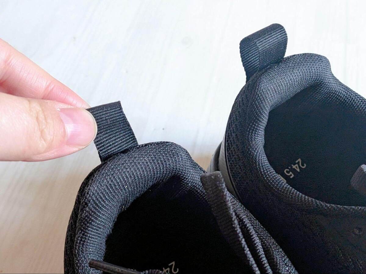 かかとにプルストラップがついているのも、地味にうれしいポイント。靴を履く場面でも、簡単にサッと着用できます。