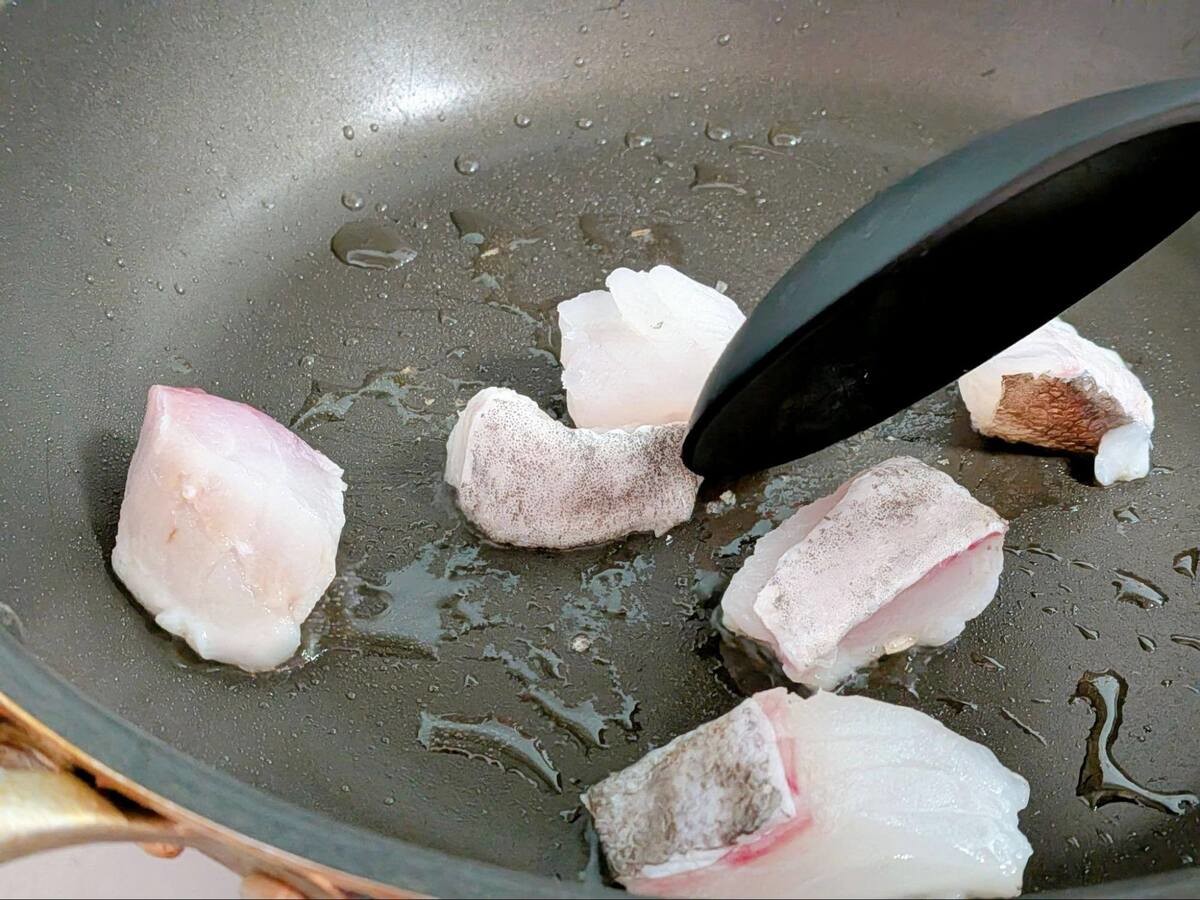 私は食べごたえに期待して少し大きめに切りましたが、火が通るまで時間がかかり、その後の炒める過程で身がほぐれて最初の形は維持されませんでした。