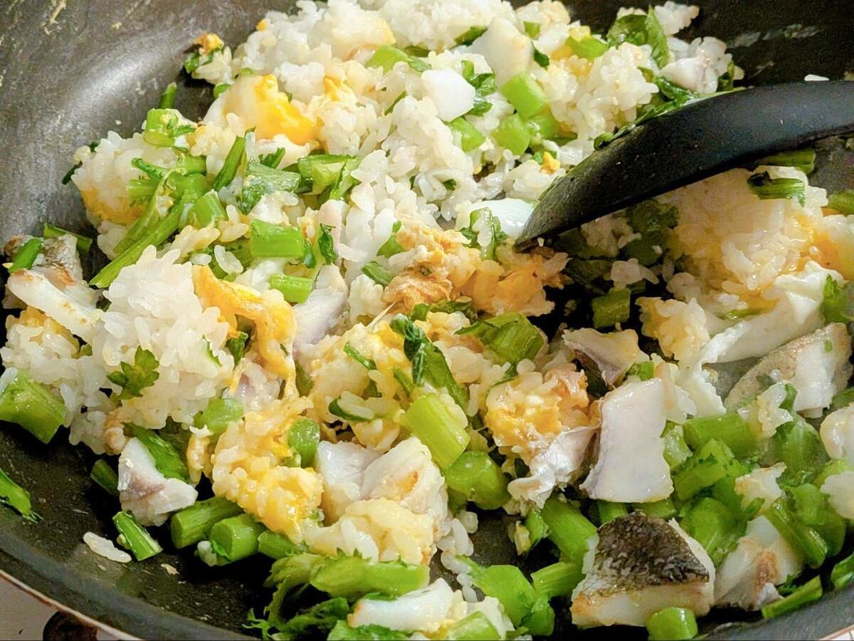 タラを炒めているフライパンに卵を直接割り入れ、ごはんと春菊の茎を入れて炒めてください。