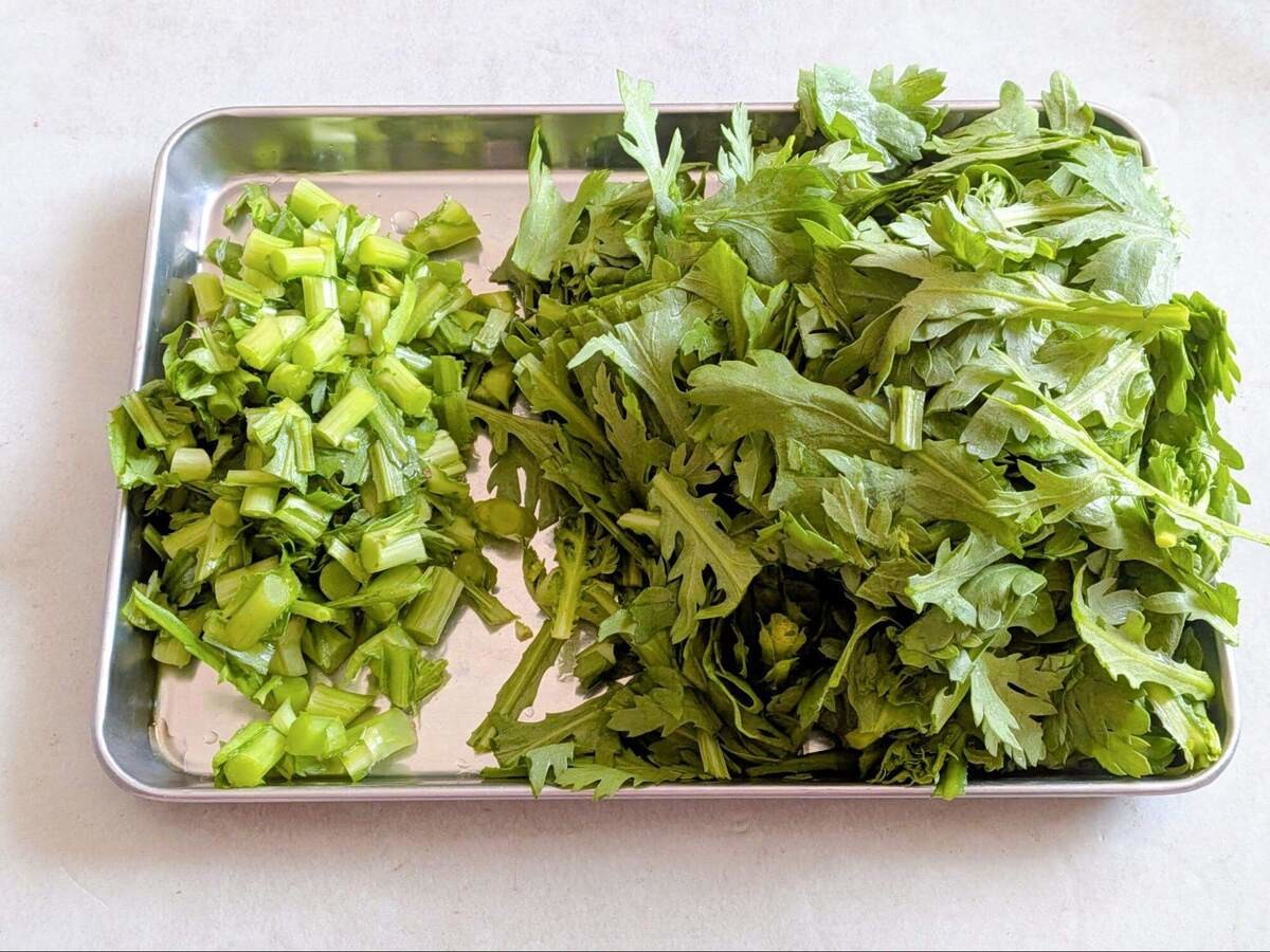 春菊の茎は食べやすいよう細かく、葉は食感が残るよう大きめにカットします。