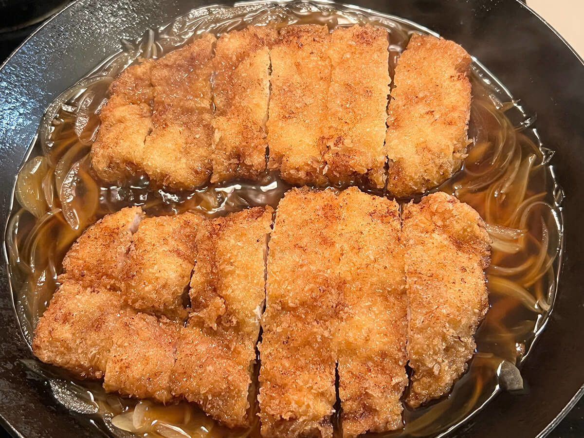作り方⑤カツを揚げ、玉ねぎを煮る