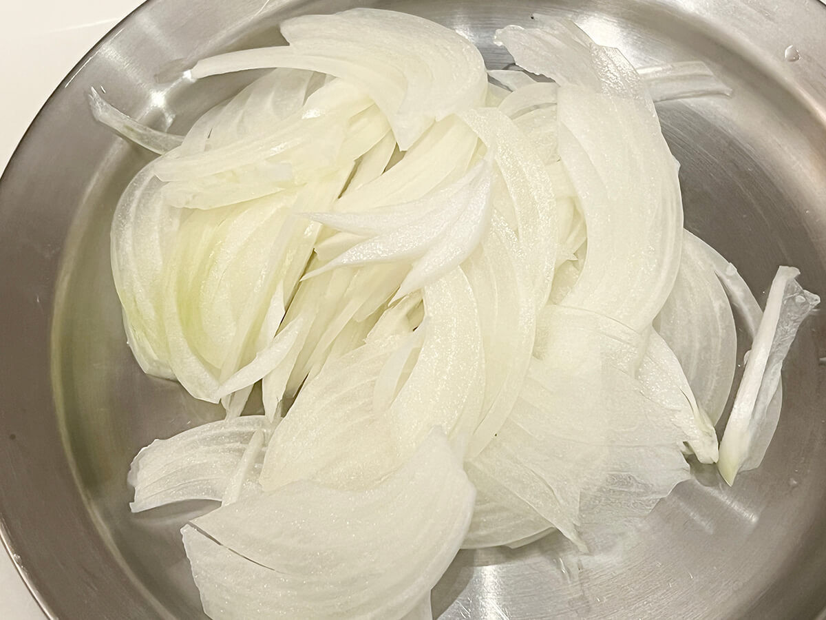 休ませている間に玉ねぎを煮ていきます。【B】を全てフライパンに入れ、玉ねぎも入れて中火でしんなりするまでしばらく煮ます。