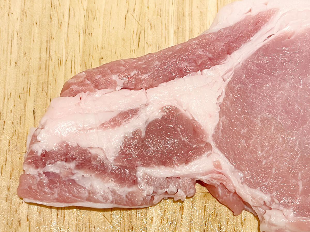 筋切りをします。脂身と肉の境目に包丁を入れ、これを両面にやっておきましょう。