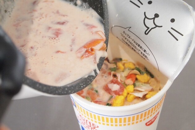 いつものカップヌードルをお湯の代わりに「トマト缶」や「牛乳」でアップデート!