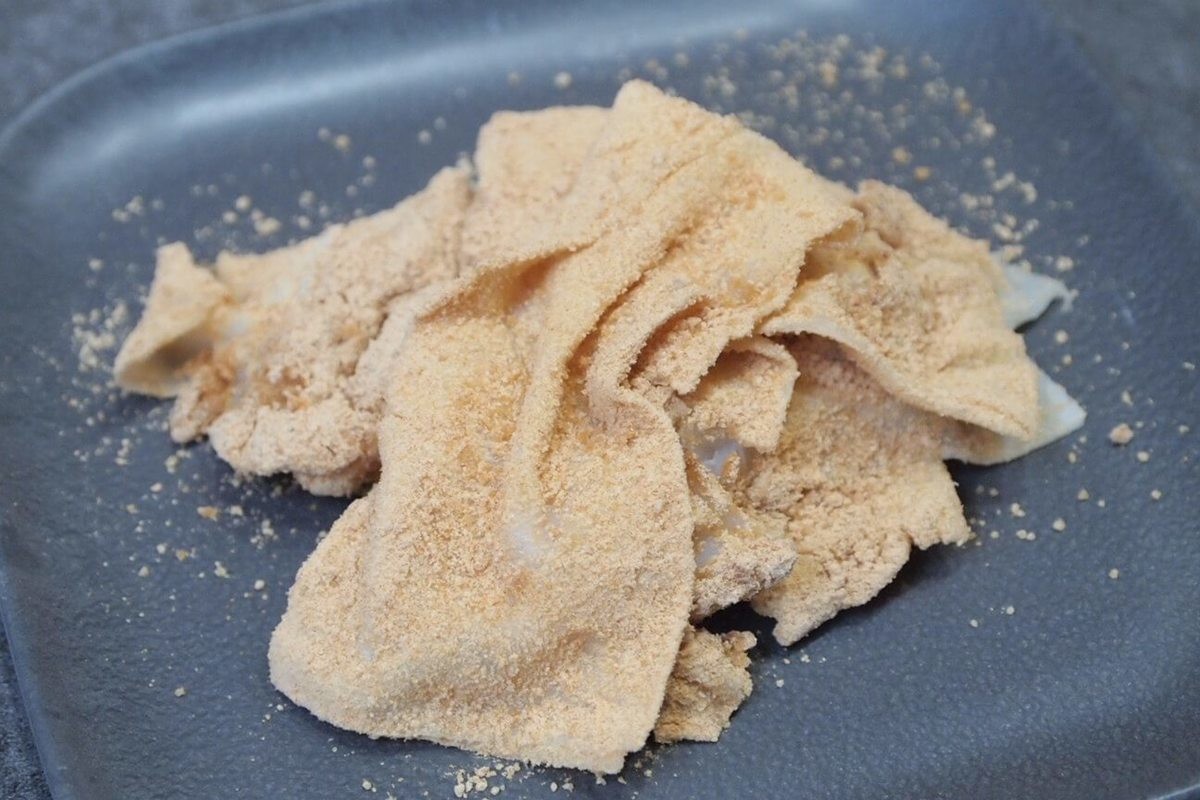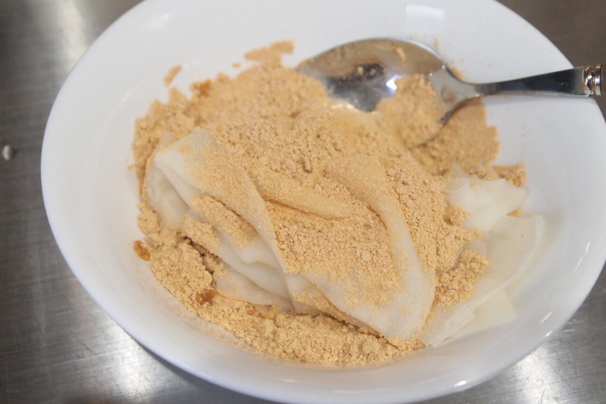湯がいた春巻きの皮を、水けをきって、きな粉のお皿に入れ、和えたら完成です!