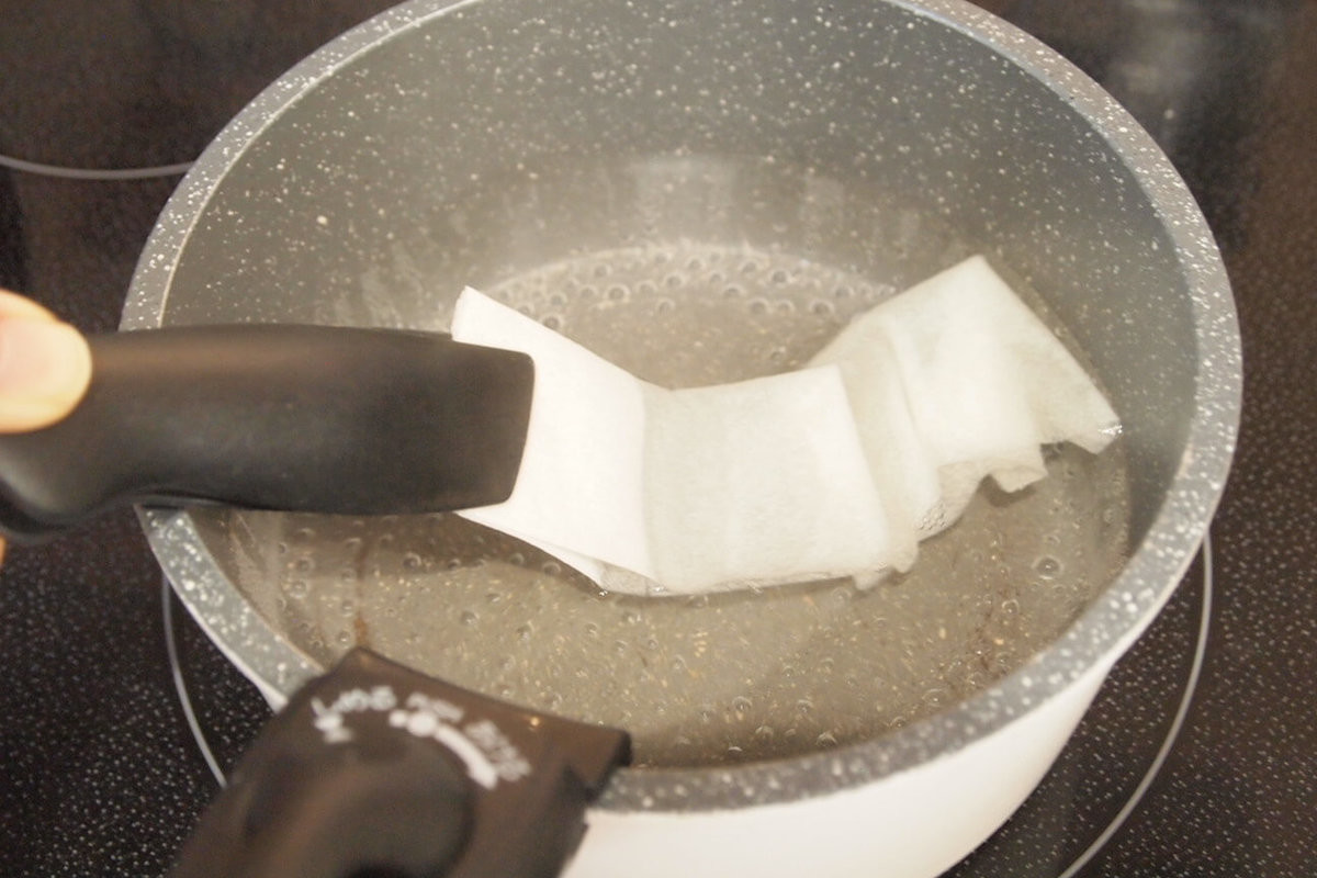 長時間お湯に入れると皮が溶けてドロドロになったり、千切れたりしてしまいます。トングなどで持ち、「サッ、サッ」とくぐらせる程度で十分です。