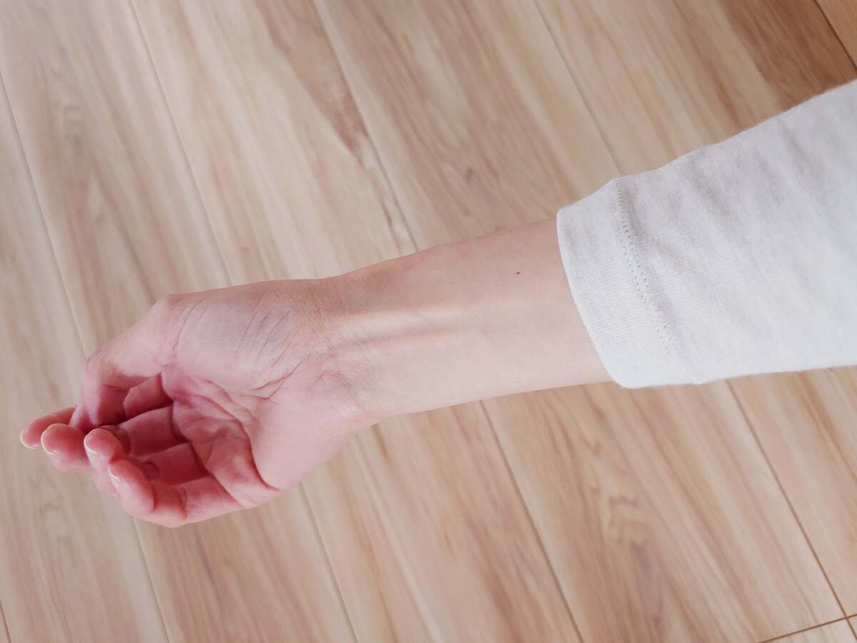 長袖ですが、手首まで余裕がある長さで、袖からヒートテックがはみ出ることもありません。