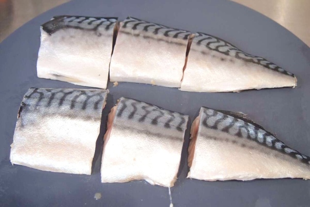 塩さばは水気を拭き取って、3等分に切り、フライパンに並べておきます。