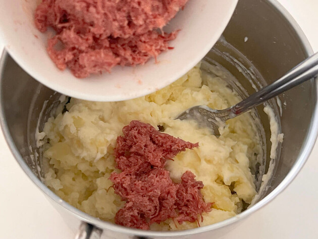 作り方②じゃがいもをつぶし、生クリームとコンビーフを混ぜて調味する