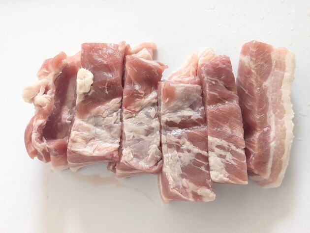 豚肉を2cm程の幅に切り、さらに縦に切って3cm程の棒状にします。