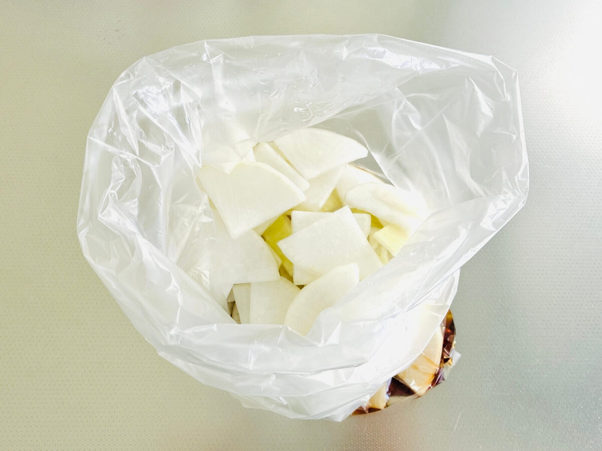 ポリ袋に大根を入れます。