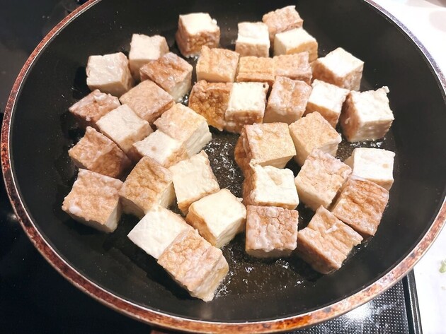 作り方③油をひいたフライパンで厚揚げを焼く