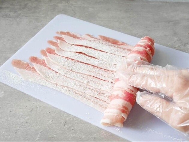 豚バラ肉を半分ずつ重ねて並べ、塩、コショウと小麦粉を振りかけます。小麦粉は茶こしを使うと満遍なくかけられますよ。