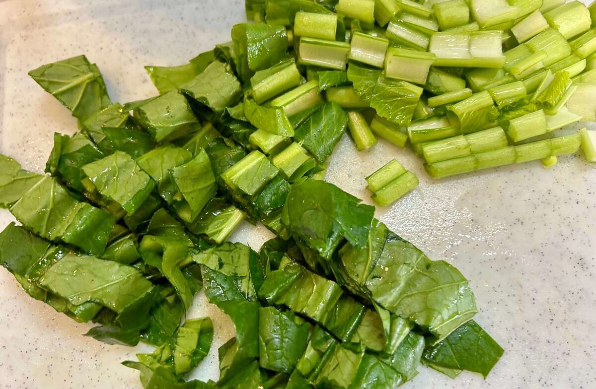 小松菜は細かく切り、茎と葉を分けておきましょう♪