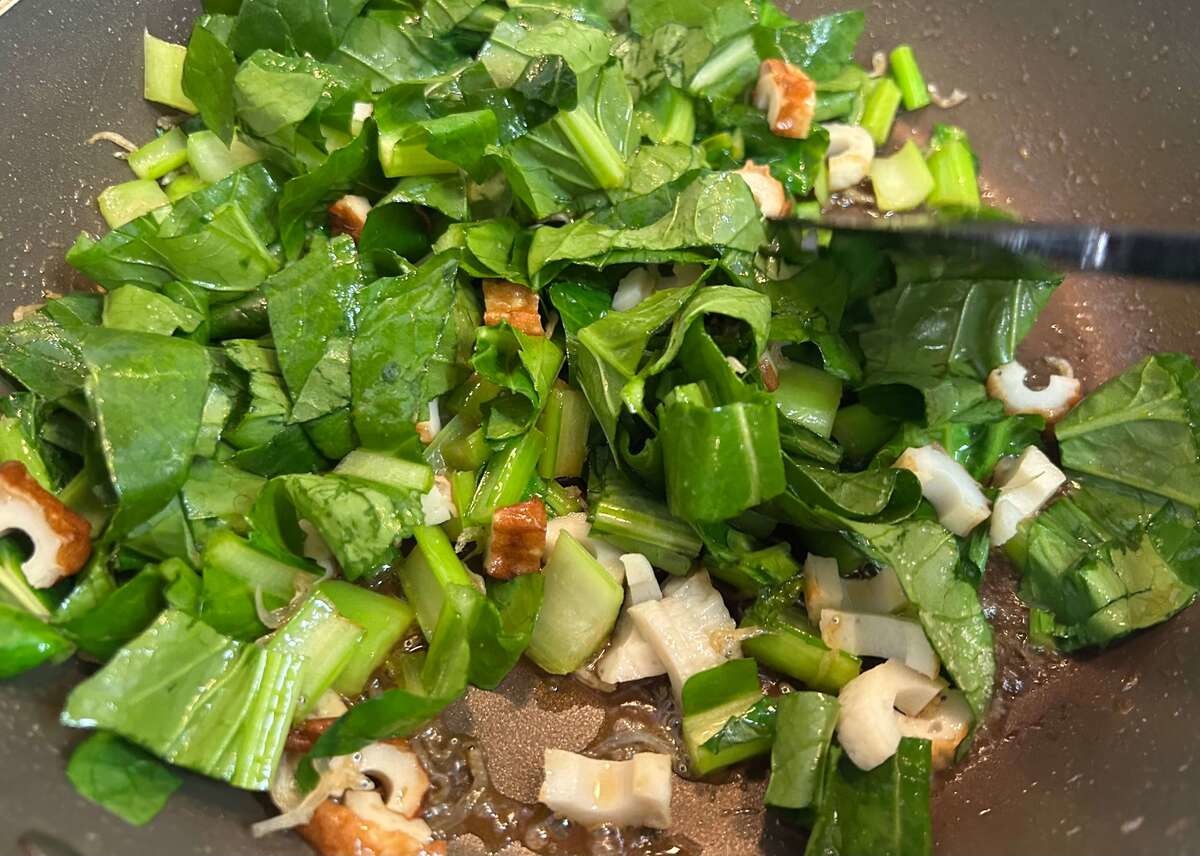小松菜の葉、ちくわ、【A】を加えたら、汁気がなくなるまで炒めます。この段階で、すでにお腹が鳴りそうなほど香ばしく食欲をそそる香りがふわ〜っと漂ってきました……!