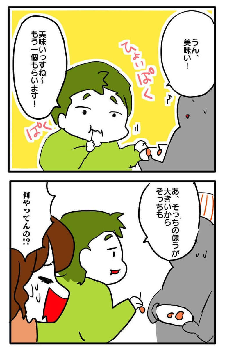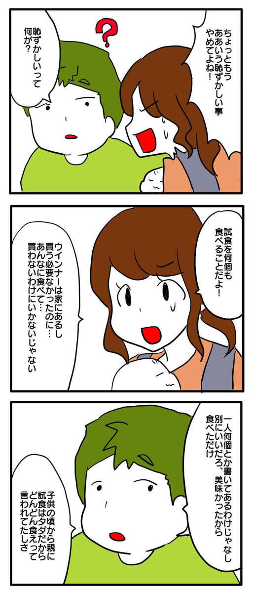 恥ずかしい思いをした妻は、夫にもうそんなことはしないように言いますが、「試食はタダだからどんどん食えって親に言われた」と全く悪びれもしません(泣)。