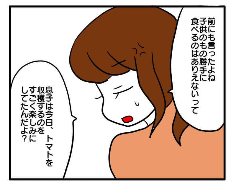 ミニトマトの鉢には息子の名前が書かれおり、明らかに子どものものとわかるものでした。それを食べておいて、なぜそんなに堂々としていられるの……(怒)!?