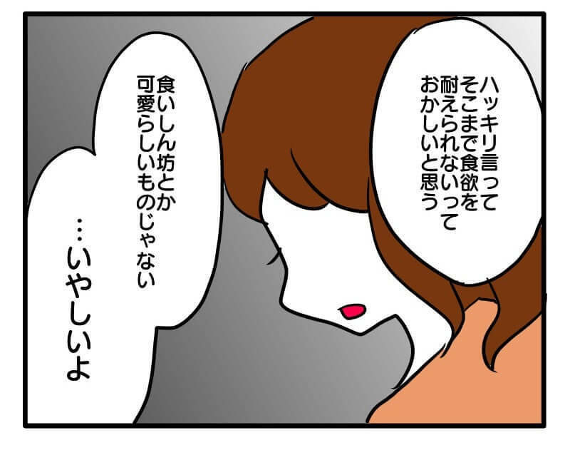 限界を迎えた妻は、ついに「ハッキリ言ってそこまで食欲を抑えられないのはおかしい」「いやしいよ」と、冷酷な事実を突き放すように伝えます。