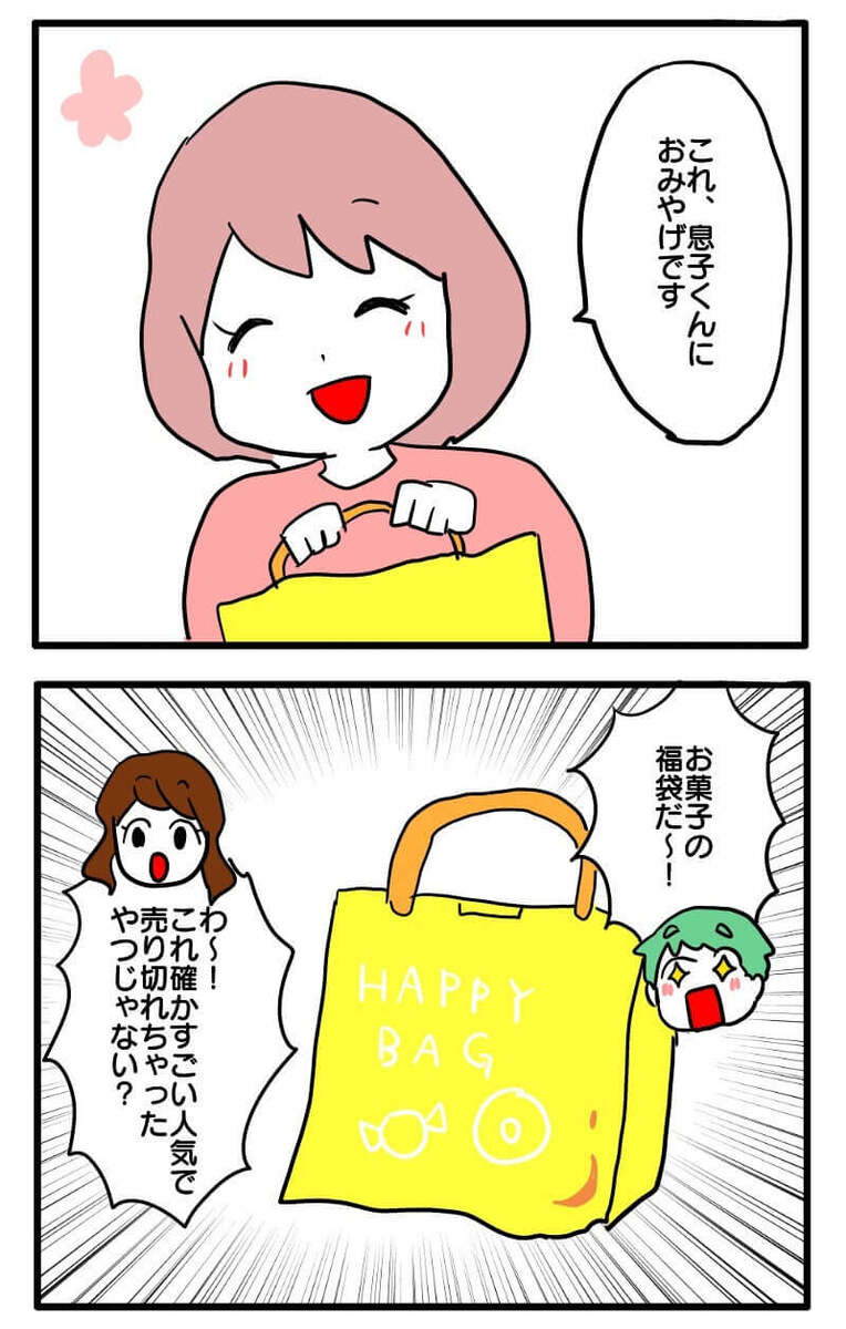 優しい義妹さんから、大人気で品薄のお菓子の福袋をもらって息子は大喜びです。