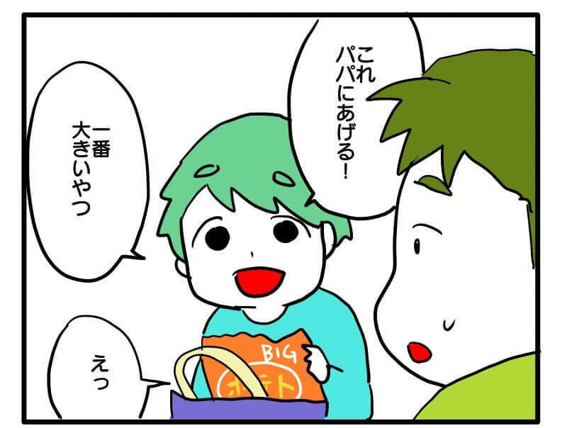 すると息子はあっさり許しただけでなく、なんと買ってきた中で一番大きなお菓子を「これパパにあげる!」と笑顔で差し出したのです……(大号泣)!!!