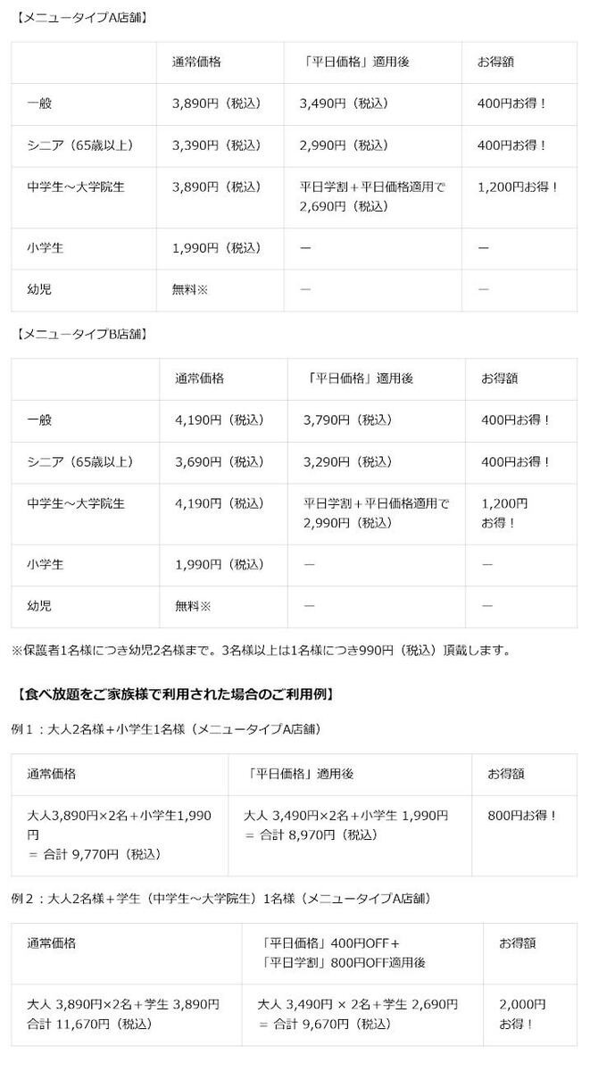 かっぱ寿司の「食べ放題」+「平日価格」「平日学割」の概要