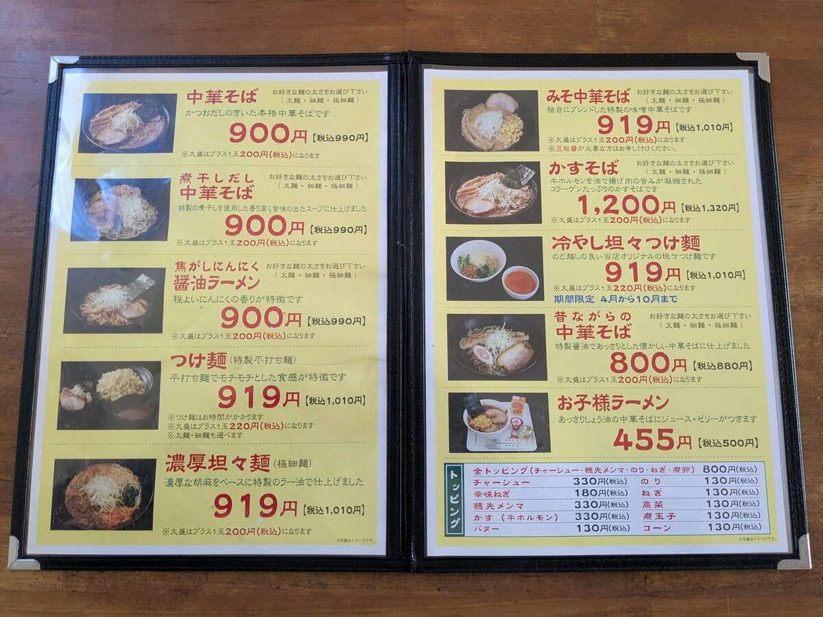 看板メニューの中華そばやつけ麺、煮干しだし中華そば、焦がしニンニク醤油ラーメン、濃厚担々麺など幅広いジャンルの麺類を楽しめます。