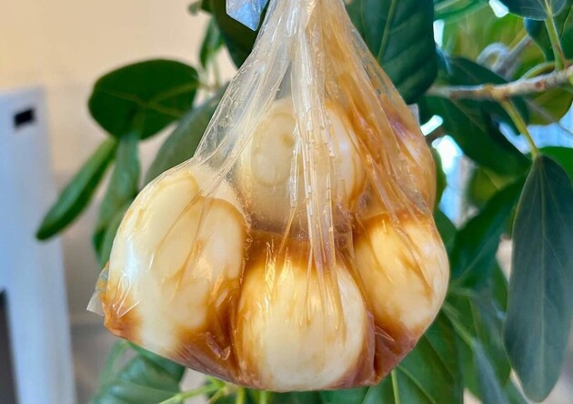 ゆで卵を加えたら空気を抜くように密封させ、冷蔵庫で1時間以上冷やしたら完成です!