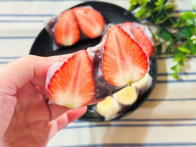 持ってみるとライスペーパーはもちもちした感触。食べるといちごのフレッシュな甘酸っぱさとあんこの甘さがベストマッチ!