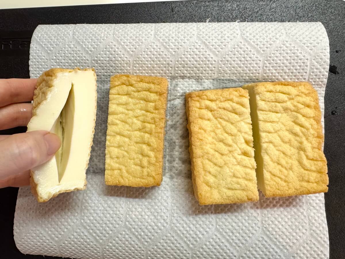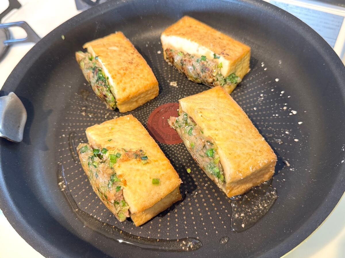 厚揚げの大きさによるのかもしれませんが、筆者は無理して詰めるのをやめて少しタネが余りました。