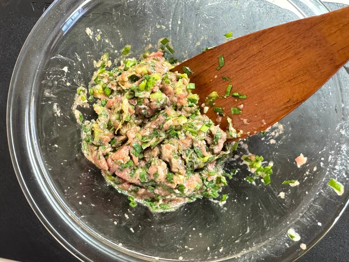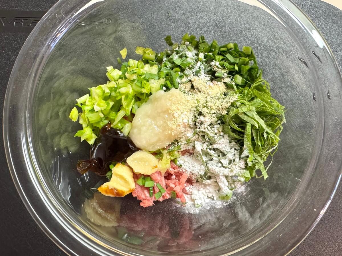 ボウルに、豚ひき肉、①の野菜、【A】を全て入れます。