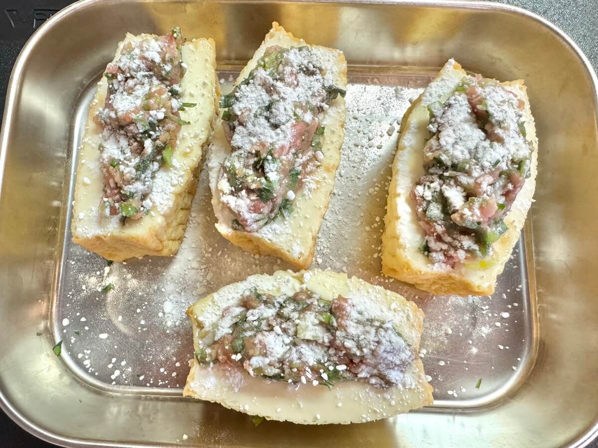 作り方④厚揚げにタネを詰めて片栗粉をまぶす