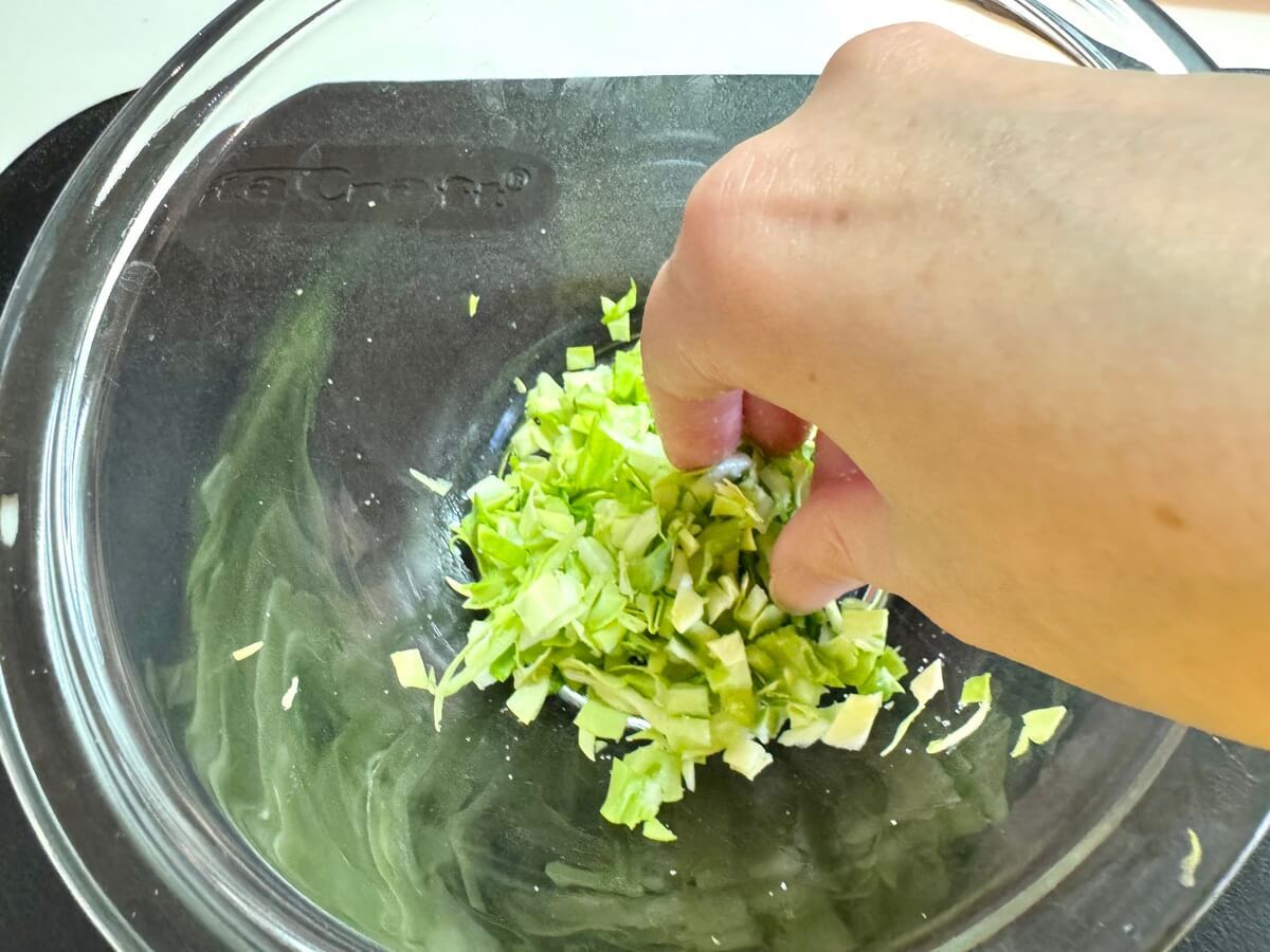 キャベツは粗みじんにし、塩少々をふってしっかり揉み込みます。